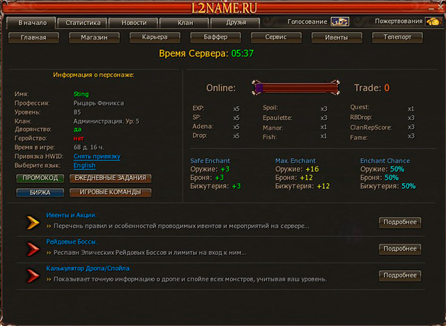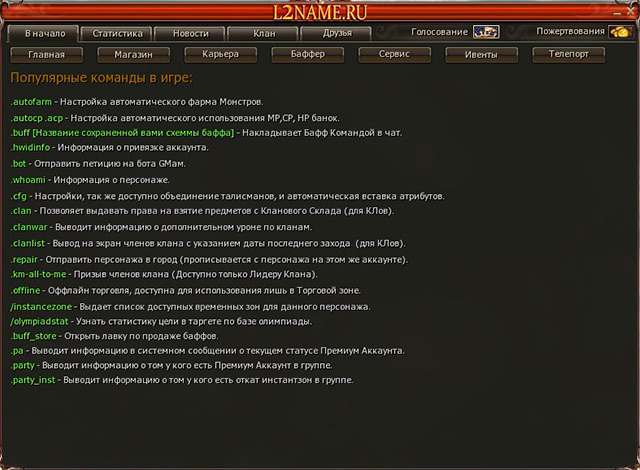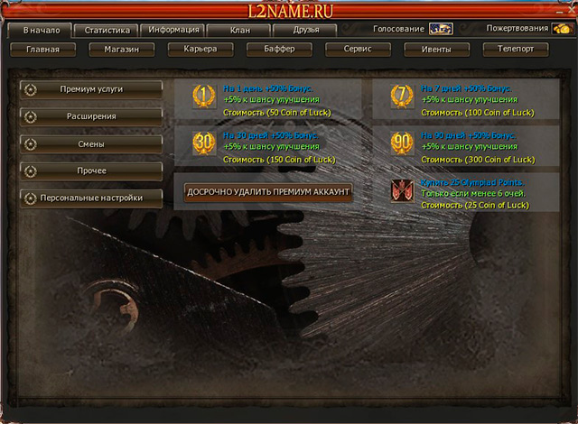 - Премиум аккаунт увеличивает EXP, SP, Adena, Drop, Spoil, Quest, Epaulettes на 50%
